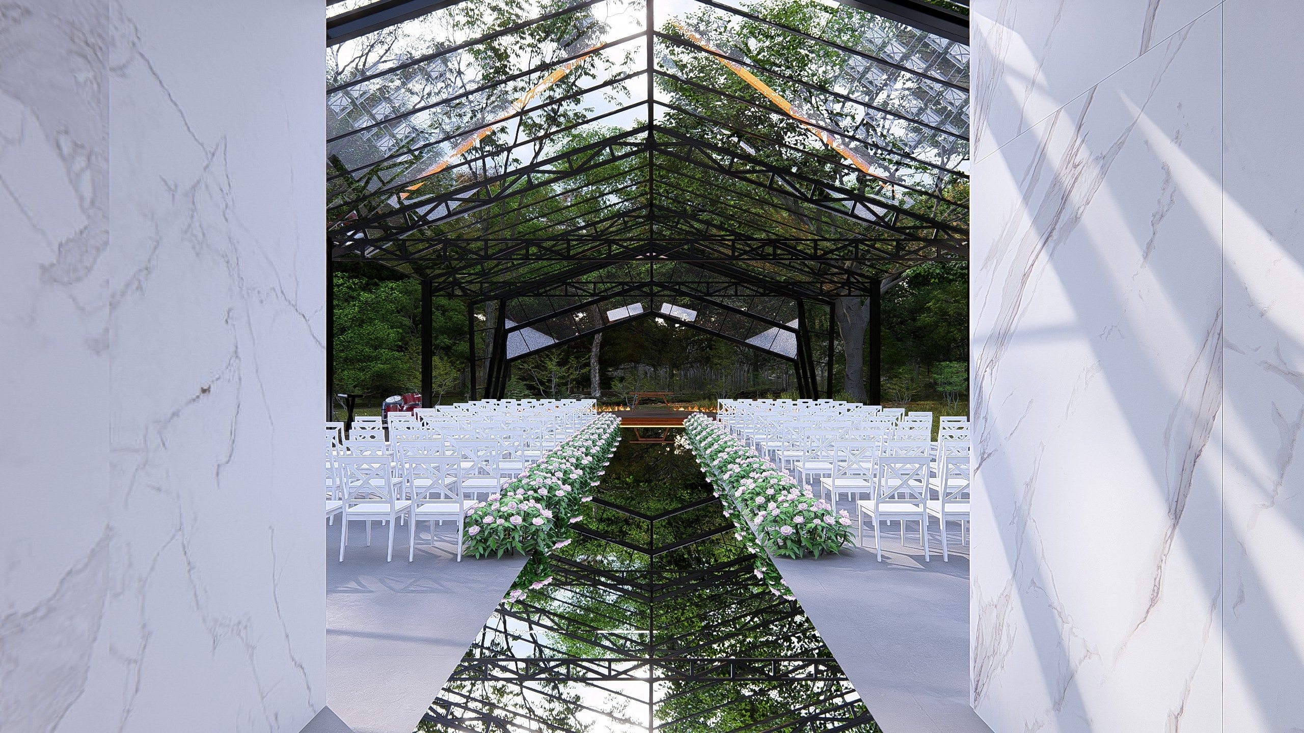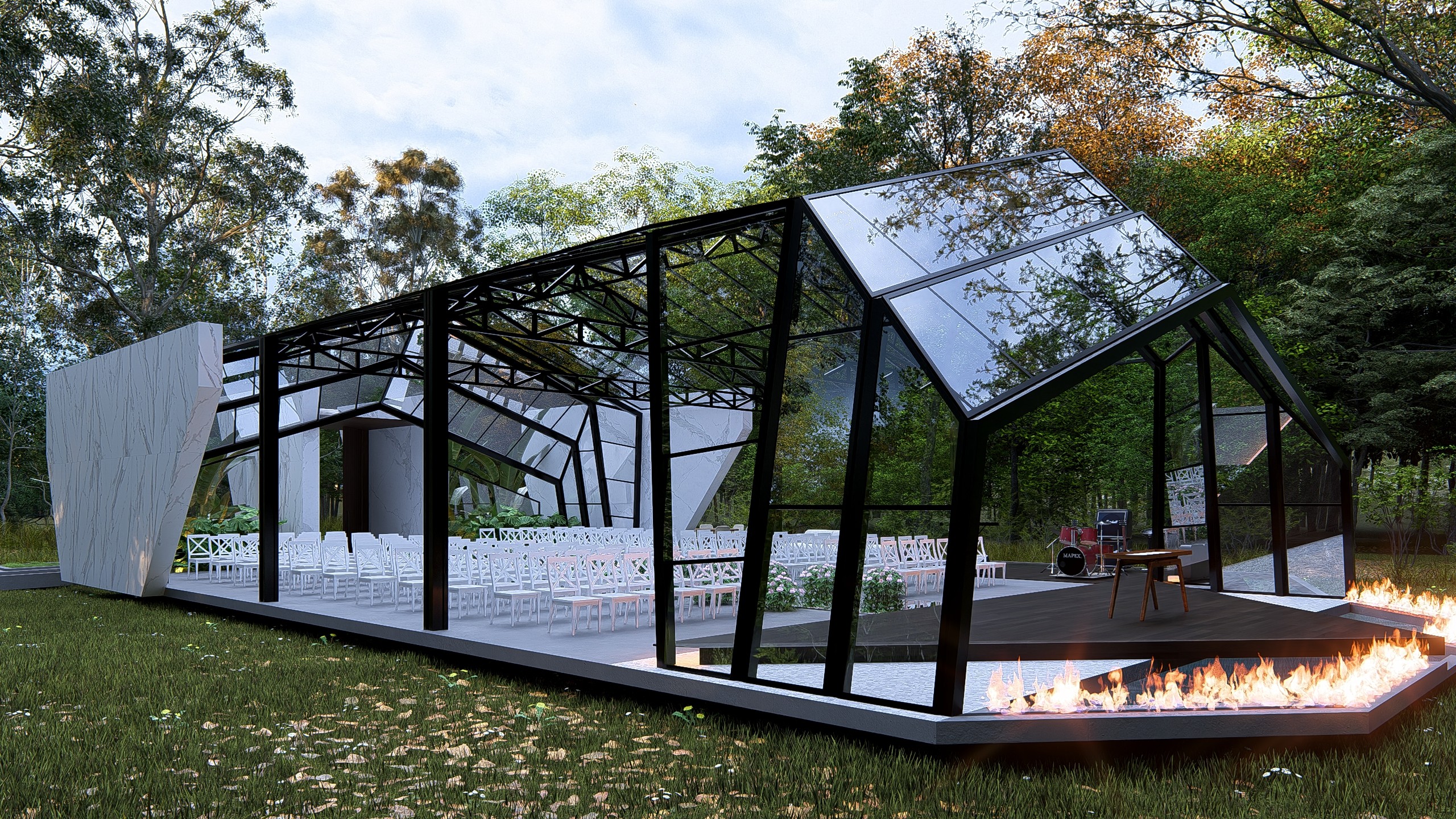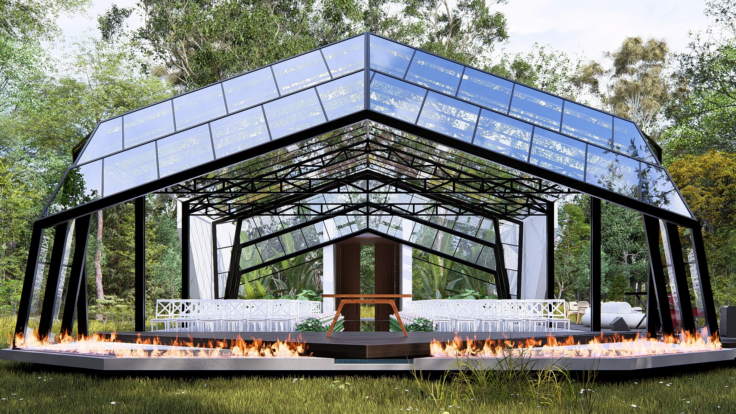 O projeto foi concebido para cerimônias de alto impacto estético, onde cada elemento compõe uma narrativa visual poderosa. A entrada monumental combina planos de concreto bruto com painéis de madeira verticalizados, criando um portal simbólico de passagem. O caminho central é ladeado por espelhos d'água com bordas de fogo, evocando elementos naturais em contraste. O teto em vidro permite visuais para o entorno verde e o céu, tornando o ambiente mutável ao longo do dia e da noite. O espaço foi pensado para transcender a função: é cenário, é ritual, é memória. Uma arquitetura que impressiona sem excessos, equilibrando natureza, escultura e emoção em cada detalhe.