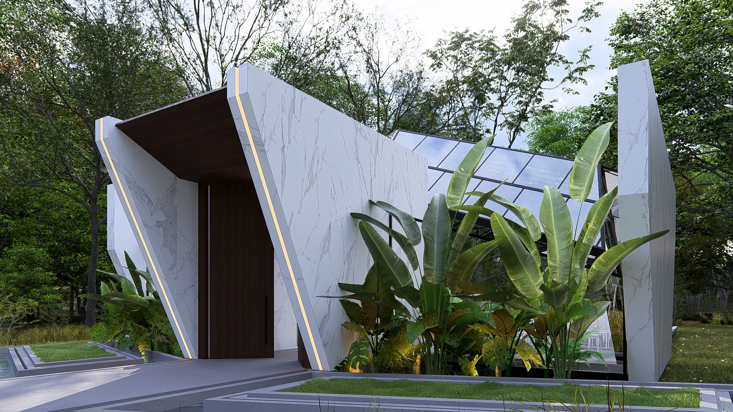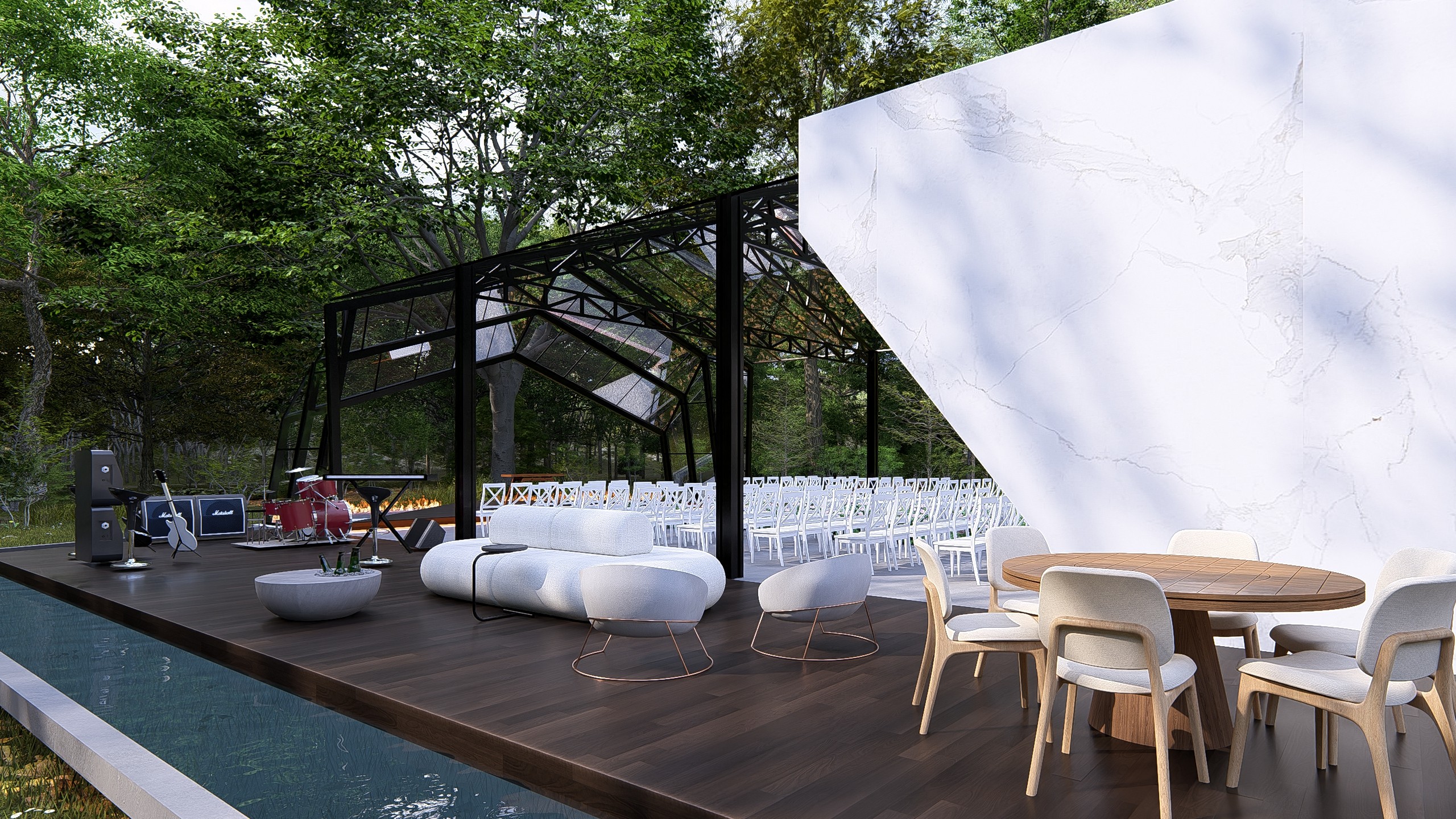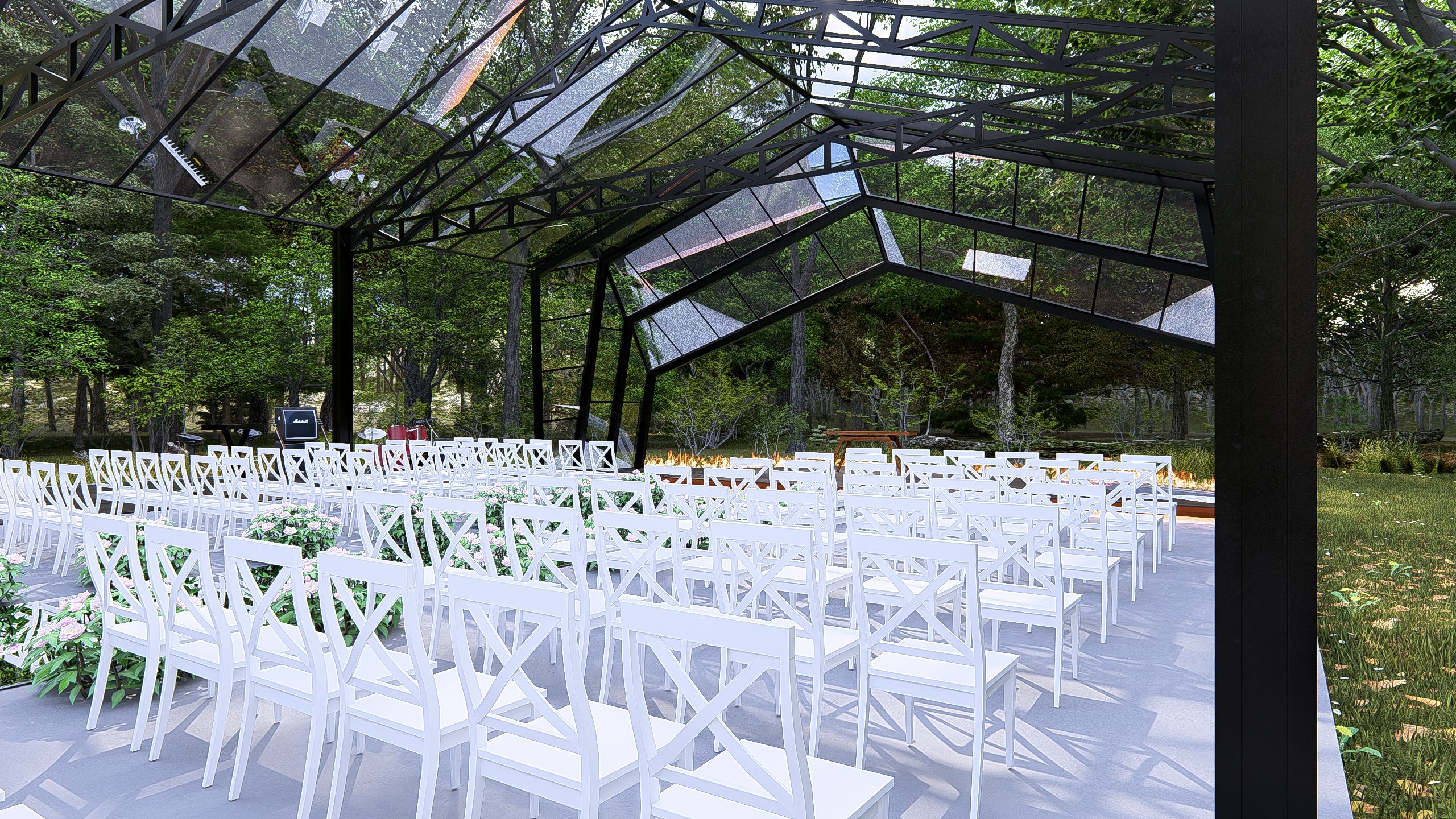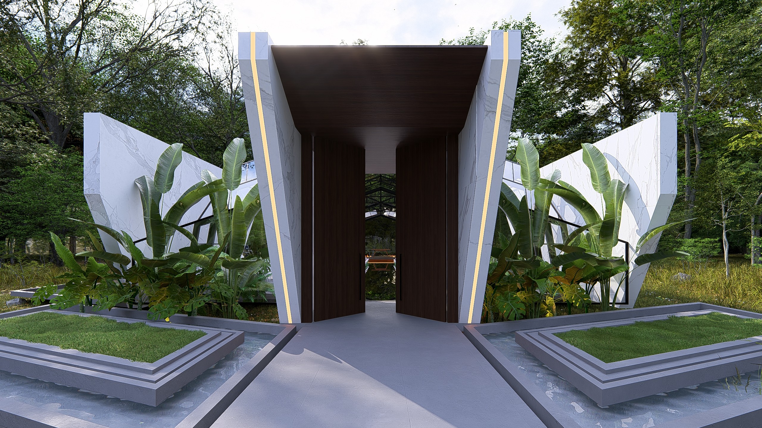 O projeto foi concebido para cerimônias de alto impacto estético, onde cada elemento compõe uma narrativa visual poderosa. A entrada monumental combina planos de concreto bruto com painéis de madeira verticalizados, criando um portal simbólico de passagem. O caminho central é ladeado por espelhos d'água com bordas de fogo, evocando elementos naturais em contraste. O teto em vidro permite visuais para o entorno verde e o céu, tornando o ambiente mutável ao longo do dia e da noite. O espaço foi pensado para transcender a função: é cenário, é ritual, é memória. Uma arquitetura que impressiona sem excessos, equilibrando natureza, escultura e emoção em cada detalhe.